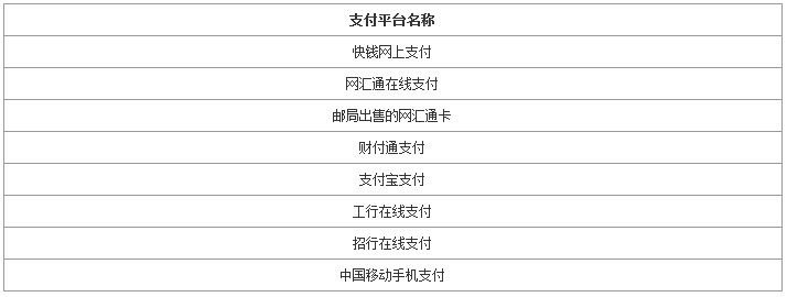 本商城提供快钱网上支付、网汇通网上支付、财付通账户支付、工行在线支付、招行在线支付、支付宝支付和中国移动手机支付7种在线支付方式,几乎涵盖所有大 中型银行发行的银行卡,覆盖率达98%,包括可通过在邮局购买网汇通卡进行网汇通线上支付和充值财付通账户进行支付。选择在线支付,您的银行卡需要开通相 应的在线。