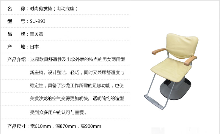 • 展品库存清仓 日本进口宝贝蒙 时尚剪发椅SU-993(电动底座)(黄)